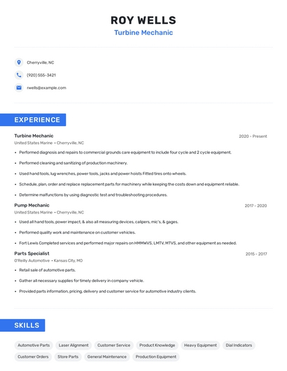 Build a professional turbine mechanic resume in minutes. Browse through our resume examples to identify the best way to word your resume. Then choose from 5+ resume templates to create your turbine mechanic resume.