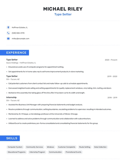 The most important skills for a type setter resume and required skills for a type setter to have include: