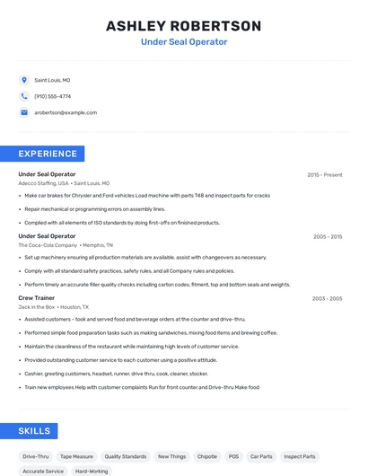 The most important skills for an under seal operator resume and required skills for an under seal operator to have include: