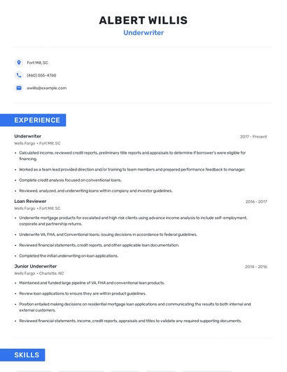 Build a professional underwriter resume in minutes. Browse through our resume examples to identify the best way to word your resume. Then choose from 5+ resume templates to create your underwriter resume.