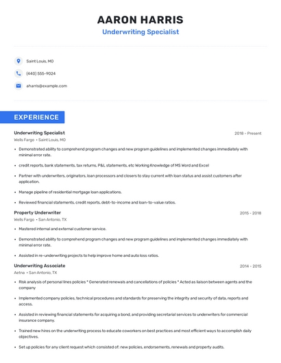 Build a professional underwriting specialist resume in minutes. Browse through our resume examples to identify the best way to word your resume. Then choose from 5+ resume templates to create your underwriting specialist resume.