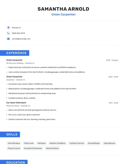 Build a professional union carpenter resume in minutes. Browse through our resume examples to identify the best way to word your resume. Then choose from 5+ resume templates to create your union carpenter resume.