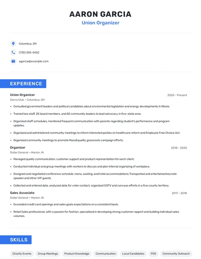 Build a professional union organizer resume in minutes. Our AI resume writing assistant will guide you through every step of the process, and you can choose from 10+ resume templates to create your union organizer resume.What skills help Union Organizers find jobs?