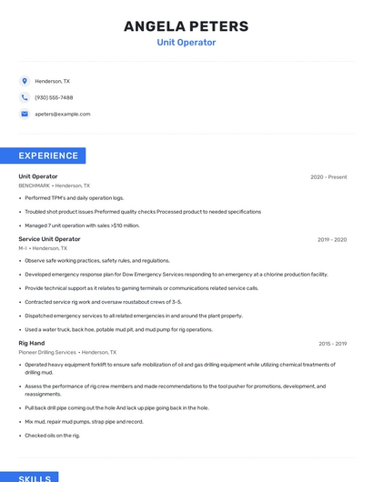 Build a professional unit operator resume in minutes. Browse through our resume examples to identify the best way to word your resume. Then choose from 5+ resume templates to create your unit operator resume.
