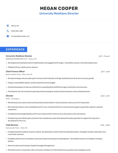 Build a professional university relations director resume in minutes. Browse through our resume examples to identify the best way to word your resume. Then choose from 5+ resume templates to create your university relations director resume.