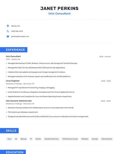 Build a professional unix consultant resume in minutes. Browse through our resume examples to identify the best way to word your resume. Then choose from 5+ resume templates to create your unix consultant resume.