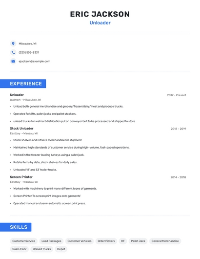 Build a professional unloader resume in minutes. Browse through our resume examples to identify the best way to word your resume. Then choose from 5+ resume templates to create your unloader resume.
