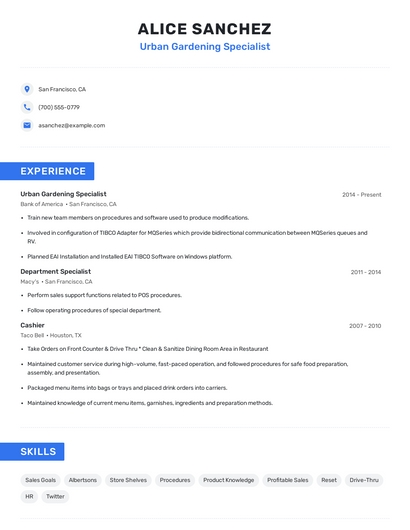 The most important skills for an urban gardening specialist resume and required skills for an urban gardening specialist to have include: