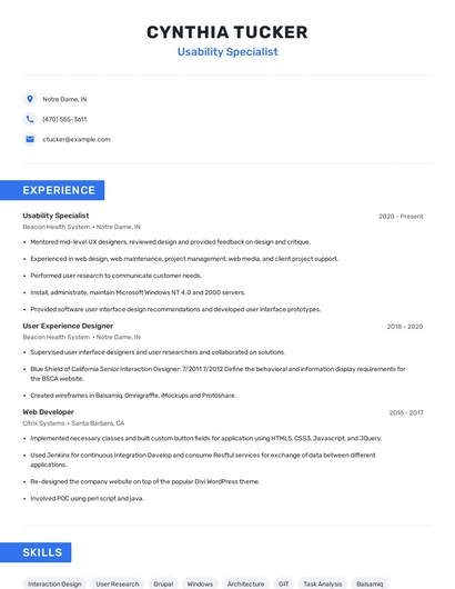 Choose from 10+ customizable usability specialist resume templates