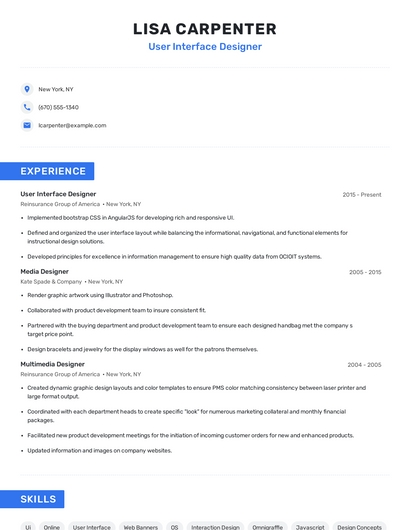 Build a professional user interface designer resume in minutes. Browse through our resume examples to identify the best way to word your resume. Then choose from 5+ resume templates to create your user interface designer resume.