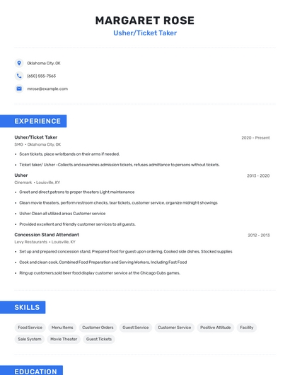 Build a professional usher/ticket taker resume in minutes. Browse through our resume examples to identify the best way to word your resume. Then choose from 5+ resume templates to create your usher/ticket taker resume.