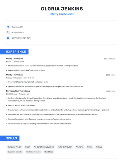 Build a professional utility technician resume in minutes. Browse through our resume examples to identify the best way to word your resume. Then choose from 5+ resume templates to create your utility technician resume.