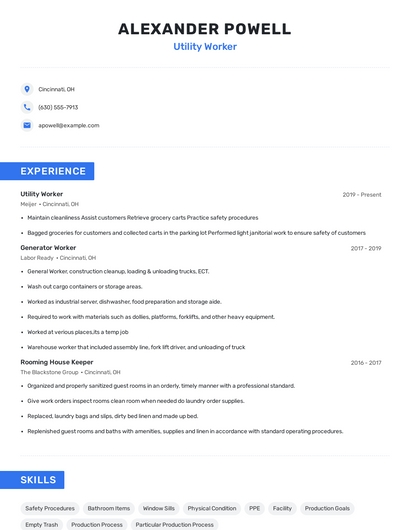 Build a professional utility worker resume in minutes. Browse through our resume examples to identify the best way to word your resume. Then choose from 5+ resume templates to create your utility worker resume.