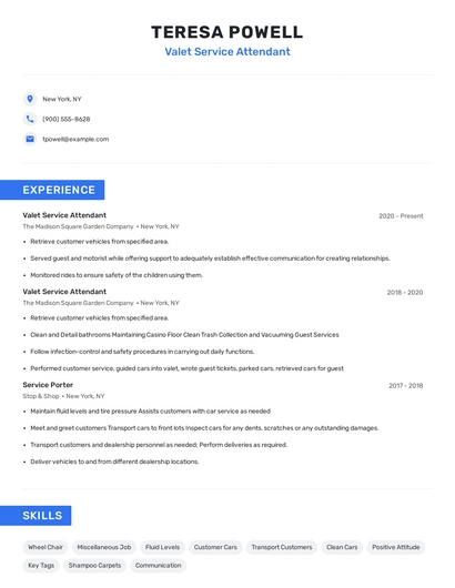 Build a professional valet service attendant resume in minutes. Browse through our resume examples to identify the best way to word your resume. Then choose from 5+ resume templates to create your valet service attendant resume.