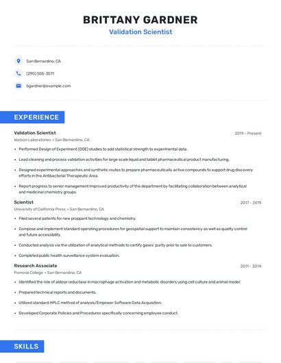 Build a professional validation scientist resume in minutes. Browse through our resume examples to identify the best way to word your resume. Then choose from 5+ resume templates to create your validation scientist resume.