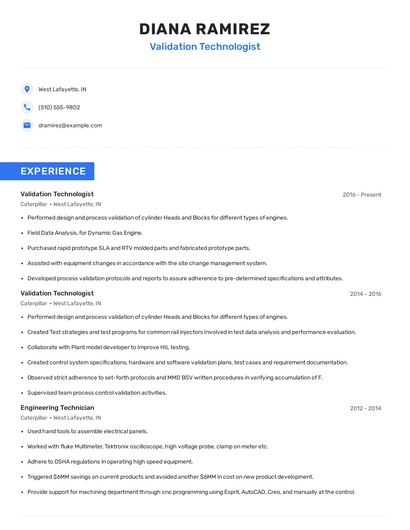 Build a professional validation technologist resume in minutes. Browse through our resume examples to identify the best way to word your resume. Then choose from 5+ resume templates to create your validation technologist resume.