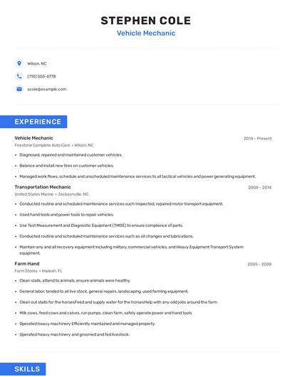 Build a professional vehicle mechanic resume in minutes. Browse through our resume examples to identify the best way to word your resume. Then choose from 5+ resume templates to create your vehicle mechanic resume.
