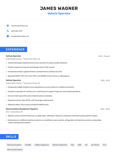 Build a professional vehicle operator resume in minutes. Our AI resume writing assistant will guide you through every step of the process, and you can choose from 10+ resume templates to create your vehicle operator resume.7. Combat