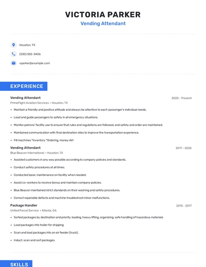 Build a professional vending attendant resume in minutes. Our AI resume writing assistant will guide you through every step of the process, and you can choose from 10+ resume templates to create your vending attendant resume.7. Coffee Machines