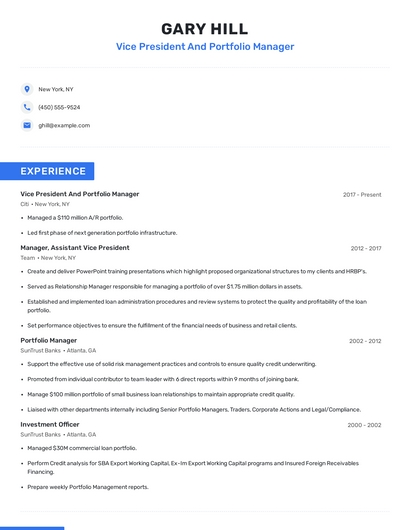 Build a professional vice president and portfolio manager resume in minutes. Browse through our resume examples to identify the best way to word your resume. Then choose from 5+ resume templates to create your vice president and portfolio manager resume.