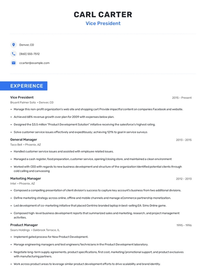 Build a professional vice president resume in minutes. Browse through our resume examples to identify the best way to word your resume. Then choose from 5+ resume templates to create your vice president resume.