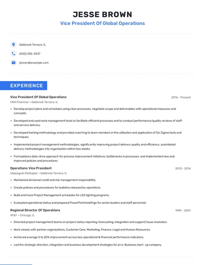 Build a professional vice president of global operations resume in minutes. Browse through our resume examples to identify the best way to word your resume. Then choose from 5+ resume templates to create your vice president of global operations resume.
