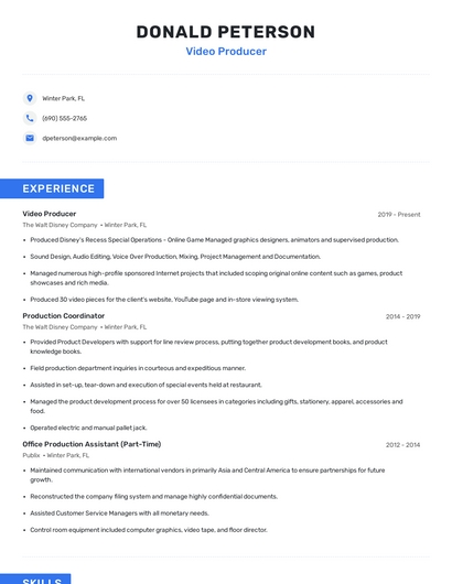 Build a professional video producer resume in minutes. Browse through our resume examples to identify the best way to word your resume. Then choose from 5+ resume templates to create your video producer resume.