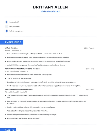 Build a professional virtual assistant resume in minutes. Browse through our resume examples to identify the best way to word your resume. Then choose from 5+ resume templates to create your virtual assistant resume.