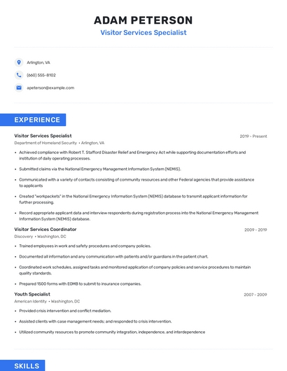 Build a professional visitor services specialist resume in minutes. Browse through our resume examples to identify the best way to word your resume. Then choose from 5+ resume templates to create your visitor services specialist resume.