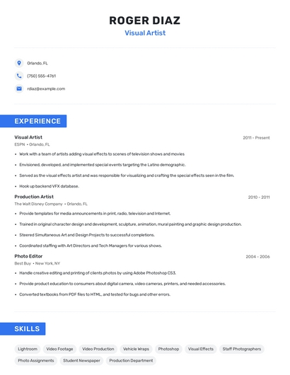 Build a professional visual artist resume in minutes. Browse through our resume examples to identify the best way to word your resume. Then choose from 5+ resume templates to create your visual artist resume.