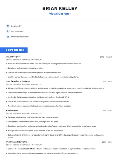 Build a professional visual designer resume in minutes. Browse through our resume examples to identify the best way to word your resume. Then choose from 5+ resume templates to create your visual designer resume.