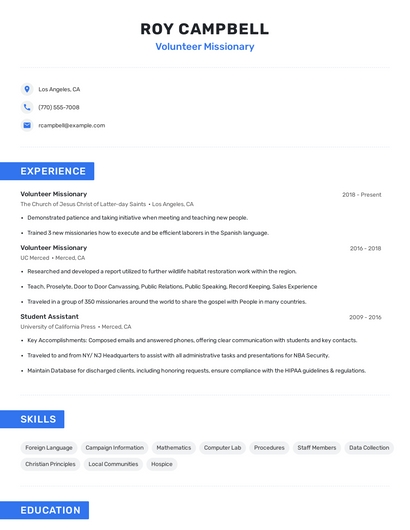 Build a professional volunteer missionary resume in minutes. Browse through our resume examples to identify the best way to word your resume. Then choose from 5+ resume templates to create your volunteer missionary resume.