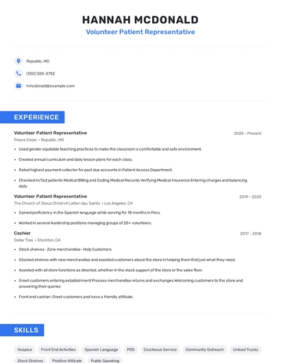 Build a professional volunteer patient representative resume in minutes. Browse through our resume examples to identify the best way to word your resume. Then choose from 5+ resume templates to create your volunteer patient representative resume.