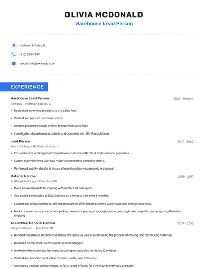 Build a professional warehouse lead person resume in minutes. Browse through our resume examples to identify the best way to word your resume. Then choose from 5+ resume templates to create your warehouse lead person resume.