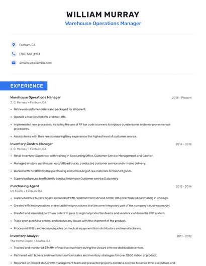 Build a professional warehouse operations manager resume in minutes. Browse through our resume examples to identify the best way to word your resume. Then choose from 5+ resume templates to create your warehouse operations manager resume.
