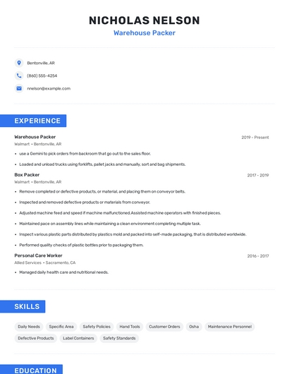 Build a professional warehouse packer resume in minutes. Browse through our resume examples to identify the best way to word your resume. Then choose from 5+ resume templates to create your warehouse packer resume.
