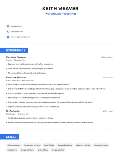 Build a professional warehouse personnel resume in minutes. Browse through our resume examples to identify the best way to word your resume. Then choose from 5+ resume templates to create your warehouse personnel resume.