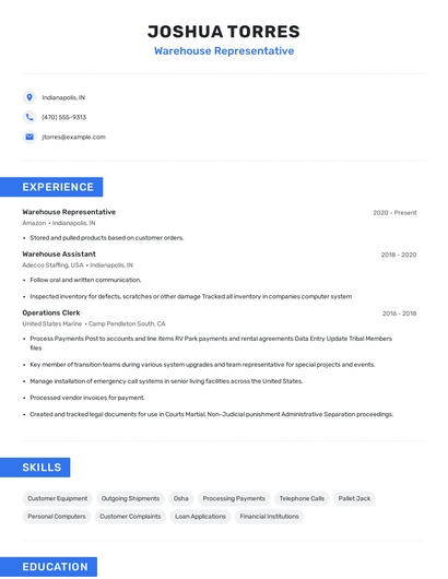 Build a professional warehouse representative resume in minutes. Browse through our resume examples to identify the best way to word your resume. Then choose from 5+ resume templates to create your warehouse representative resume.
