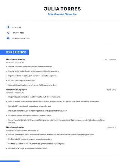 You can use Zippia's AI resume builder to make the resume writing process easier while also making sure that you include key information that hiring managers expect to see on a warehouse selector resume. You'll find resume tips and examples of skills, responsibilities, and summaries, all provided by Zippi, your career sidekick.