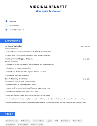 Build a professional warehouse technician resume in minutes. Browse through our resume examples to identify the best way to word your resume. Then choose from 5+ resume templates to create your warehouse technician resume.