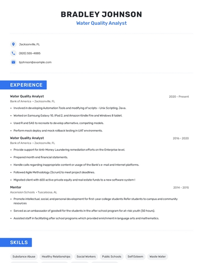 Build a professional water quality analyst resume in minutes. Browse through our resume examples to identify the best way to word your resume. Then choose from 5+ resume templates to create your water quality analyst resume.
