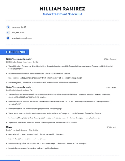 Build a professional water treatment specialist resume in minutes. Browse through our resume examples to identify the best way to word your resume. Then choose from 5+ resume templates to create your water treatment specialist resume.