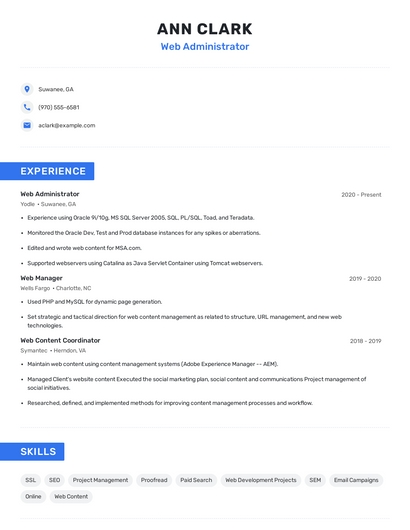 Build a professional web administrator resume in minutes. Browse through our resume examples to identify the best way to word your resume. Then choose from 5+ resume templates to create your web administrator resume.