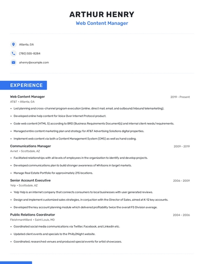 Build a professional web content manager resume in minutes. Browse through our resume examples to identify the best way to word your resume. Then choose from 5+ resume templates to create your web content manager resume.