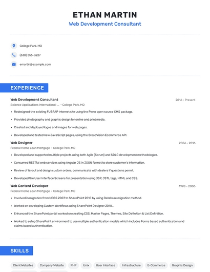 Build a professional web development consultant resume in minutes. Browse through our resume examples to identify the best way to word your resume. Then choose from 5+ resume templates to create your web development consultant resume.