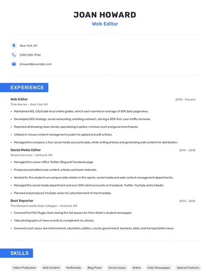Build a professional web editor resume in minutes. Browse through our resume examples to identify the best way to word your resume. Then choose from 5+ resume templates to create your web editor resume.