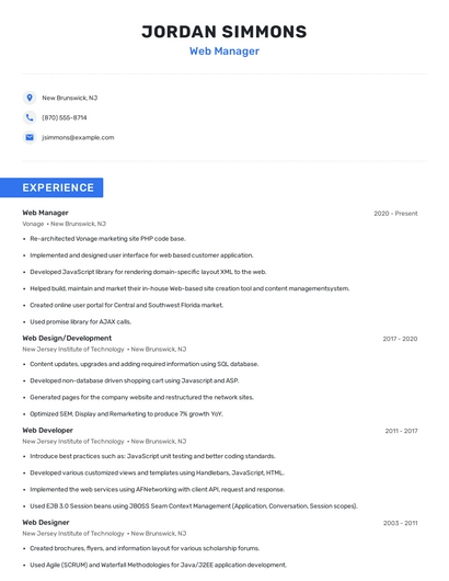 Build a professional web manager resume in minutes. Browse through our resume examples to identify the best way to word your resume. Then choose from 5+ resume templates to create your web manager resume.
