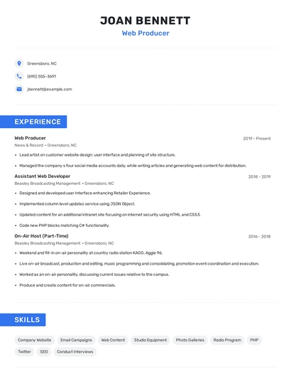 Build a professional web producer resume in minutes. Browse through our resume examples to identify the best way to word your resume. Then choose from 5+ resume templates to create your web producer resume.