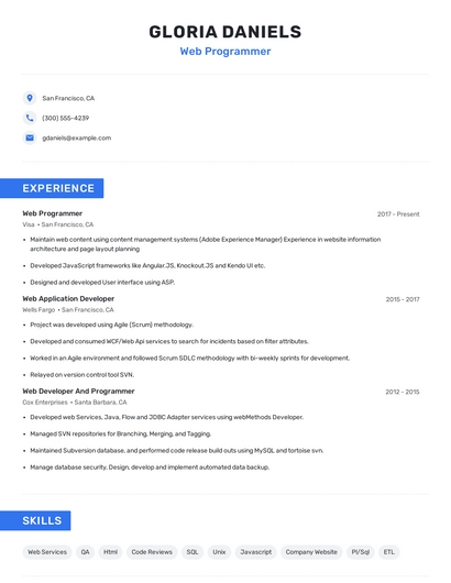 Build a professional web programmer resume in minutes. Browse through our resume examples to identify the best way to word your resume. Then choose from 5+ resume templates to create your web programmer resume.