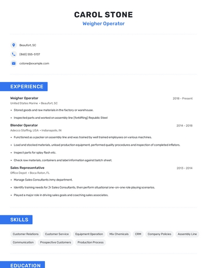 The most important skills for a weigher operator resume and required skills for a weigher operator to have include: